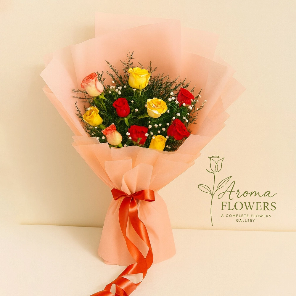 Elegant Mixed Roses Bouquet with Red, Yellow & Peach Roses in Premium Peach Wrapping