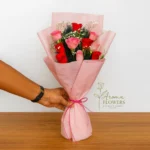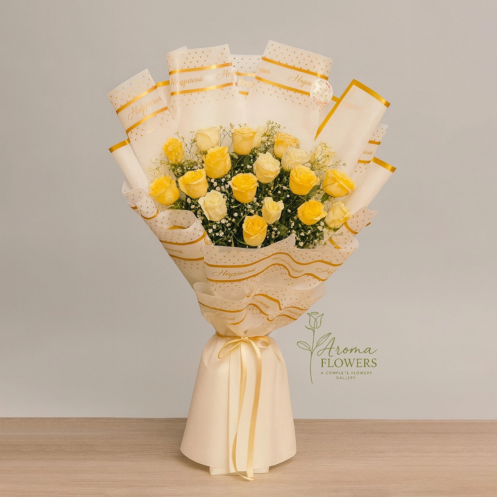 Brighten any room with the “Golden Radiance” bouquet, a cheerful yet sophisticated arrangement. This bouquet features a stunning blend of vivid yellow and soft cream roses, symbolising friendship, joy, and new beginnings. It is elegantly framed by cloud-like White Baby’s Breath and presented in high-end designer packaging.