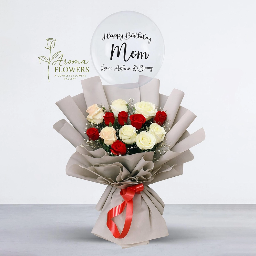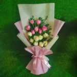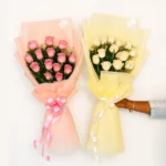 A cheerful blend of bright yellow and soft cream roses accented with delicate white baby’s breath. This premium bouquet is presented in a designer cream and gold-trimmed fan-style wrap and finished with a matching satin ribbon, making it an ideal gift for celebrations and graduations
